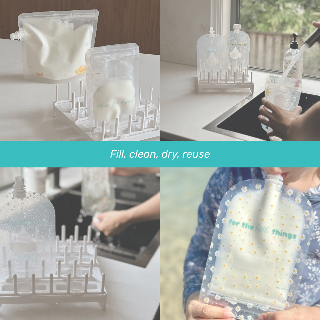 • Dry your Sinchies custom Sinch Station - our all-in-one filling station and drying rack. The bottom gusset needs to be kept open - pop them on the prongs of your drying rack. Alternatively use a whisk, spatula or chopstick.