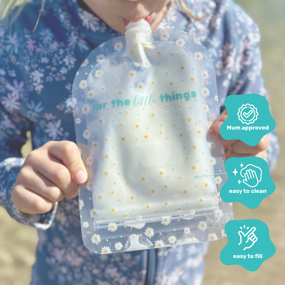 Sweet, sunny and full of good vibes - our Daisies pouch brings a little burst of happiness to every snack time. Perfect for yoghurt, smoothies or baby food, this one’s for the mums who love a touch of floral fun (and less mess in the kitchen).