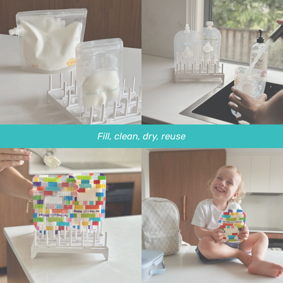 • Dry your Sinchies custom Sinch Station - our all-in-one filling station and drying rack. The bottom gusset needs to be kept open - pop them on the prongs of your drying rack. Alternatively use a whisk, spatula or chopstick.