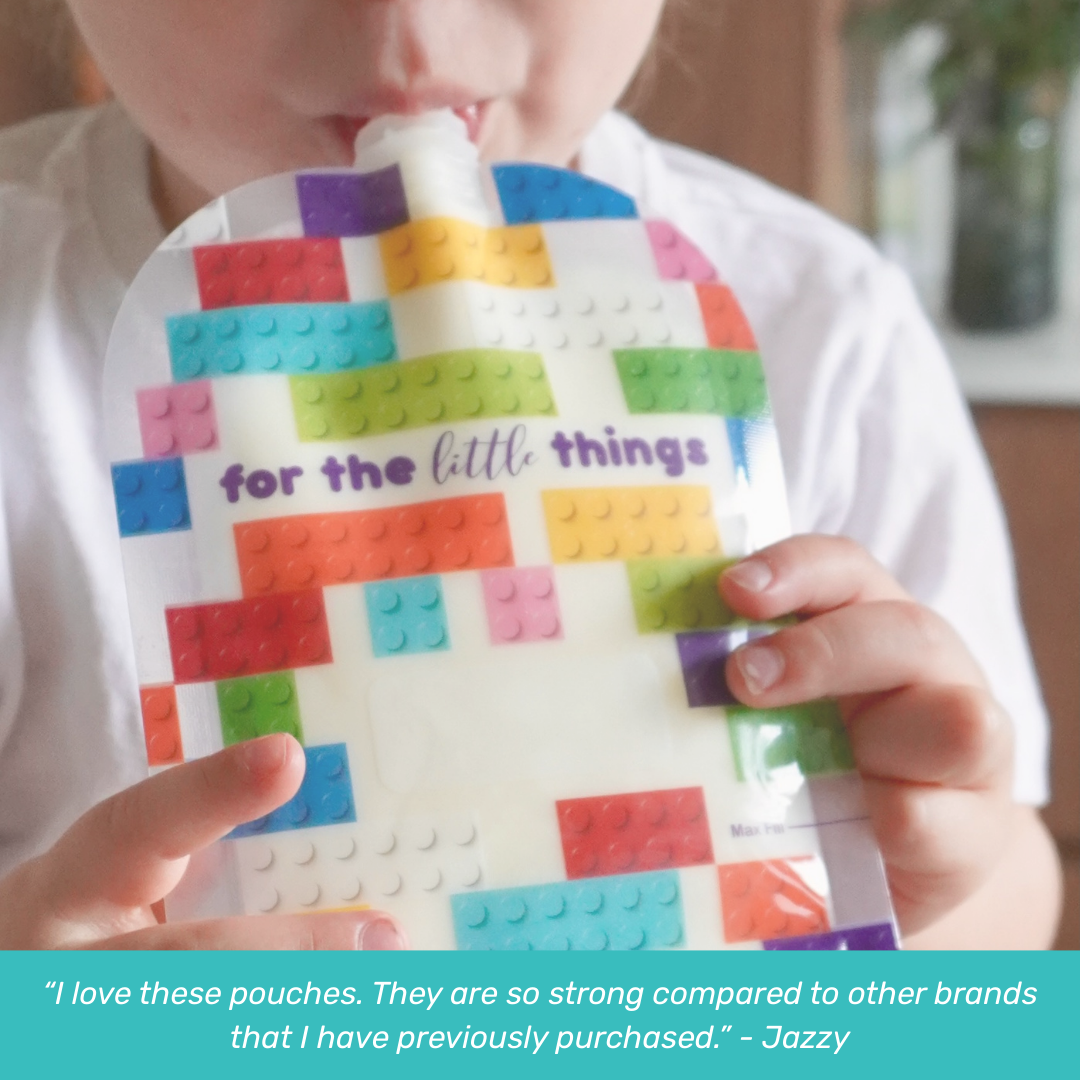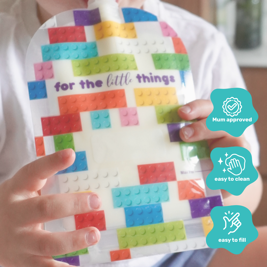 Stack it, fill it, snack it! Our Block Party pouch is all about creativity and colour - perfect for little legends who love to build, play and snack their way through the day.