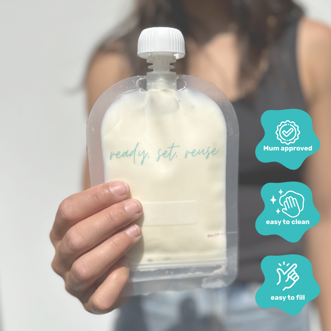 An easy-to-use, easy-to-fill, easy-to-clean reusable food pouch that eliminates the need for the expensive store-bought, single use kind. A convenient, leakproof, more affordable and sustainable way to yoghurt, puree and more!